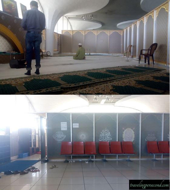 Asking to an airport policewoman after couldn’t find the sign, finally I found the mosque on up stair (second floor).