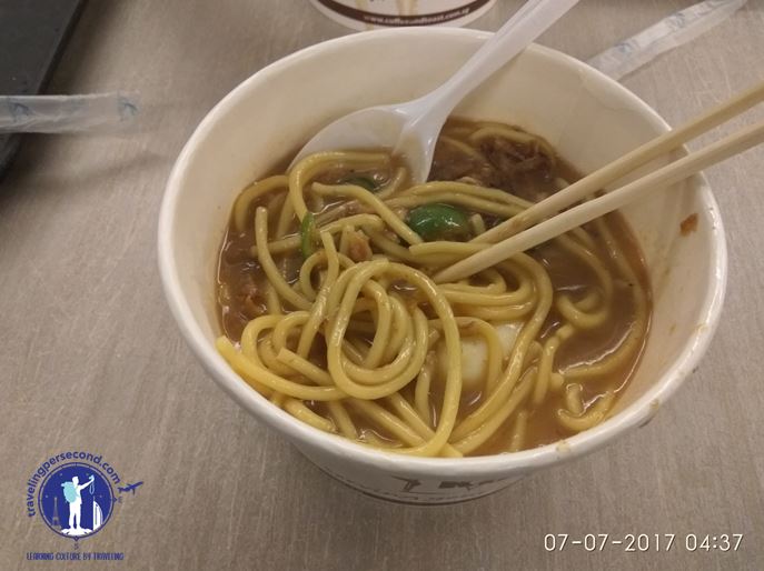 In midst of sleepiness (it was because on noon, I worked full time in Bandung. And in afternoon, I directly went to Soekarno Hatta International Airport….cool yes, my home in Jakarta, working in Bandung on noon, and in night I was in Singapore….Hahaha), I decided to eat halal-certified noodles in this restaurant: