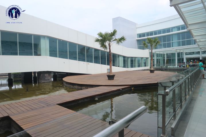 Entering commercial zone, I just continued through it, many prospective passengers seemed to be relaxing in this area, either in public area or eating food at several coffee shops. As soon as I left commercial zone, I entered a transparent roofed area with steel pillars with two LCD check-in information screens, while on right side there was a wooden deck with number of palm pots on it, while the other part was a pool which soaked terminal piles, it was giving a impression that this is a floating passenger terminal …. Very cool.