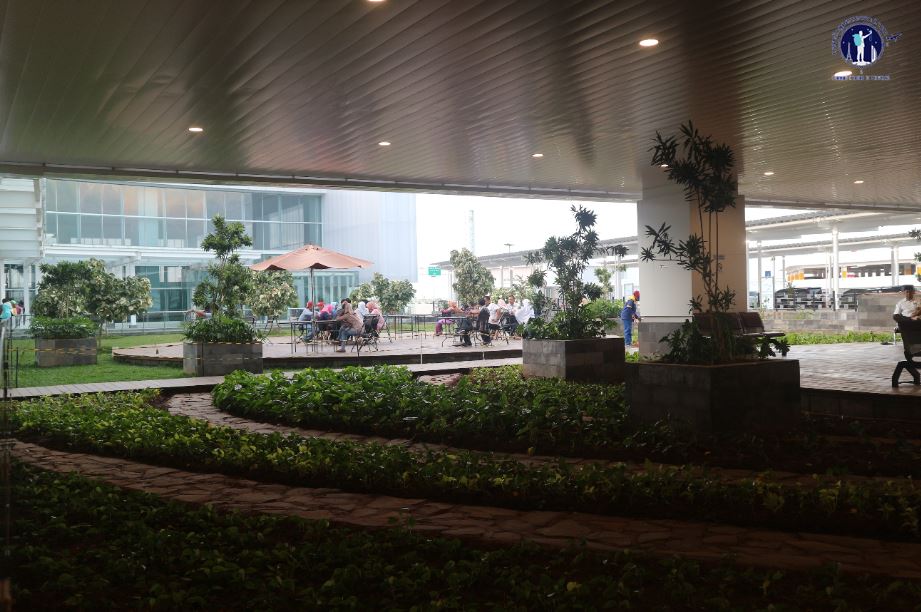 The exit area is under a canopy corridor and framed by whitewashed steel beams. This corridor connects arrival hall and commercial zone of airport. The existence of a pool, umbrella shade with chairs under it and a garden planted with medium tall trees with a patterned distribution make exit area appearance is very neat. Here is where the pick-up await their guests arrival or relatives who have just landed.