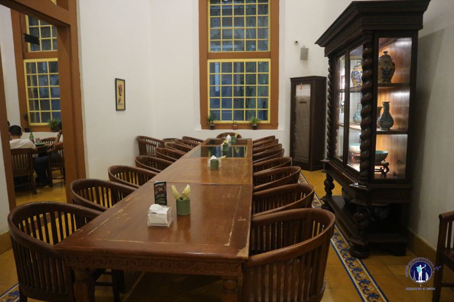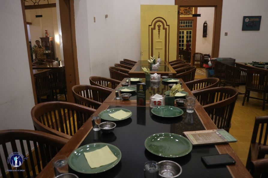 The restaurant room which followed original function of the buildingβ¦.Many rooms, each room was filled by rows of teak dining tables or teak-framed glass tables. Meanwhile, typical Betawi chairs were neatly lined up, while square windows were soaring to ceiling with trellises which have frame in mini square shape. You could see room decoration in the form of a souvenir cupboard which made from teak wood and rooms were cooled by several large fans.