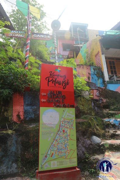 I started to enter Kampung Wonosari (the real name of Kampung Pelangi) through a sloping alley with colored pavling blocks, decorated with colorful umbrellas which provided shade from the sun, rows of flower pots made every aisle looked beautiful and information boards were placed at consistent distance. At some points of climb, a break point was provided in the form of a concrete seat, allowing some climbers who were tired to rest temporarily.