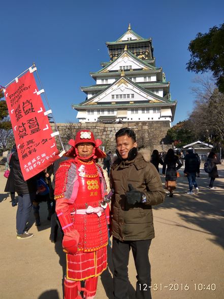 Tibalah aku di pelataran selatan, sebut saja Osaka Castle Park. Disinilah para wisatawan berkumpul dan menikmati keanggunan kastil buatan Toyotomi Hideyoshi, sang pemimpin Jepang Zaman Sengoku. Aku menyempatkan diri berfoto dengan samurai tua di pelataran kastil. Bahkan untuk mengusir kesepian, aku sering iseng dengan berpose di belakang rombongan turis yang sedang berfoto. Nyengir kuda, melompat, melambaikan tangan atau apapun kulakukan. Terkadang membuat salah satu rombongan itu menunjukku sambil tertawa setelah melihat hasil foto di kamara digital mereka. Parah akut memang.