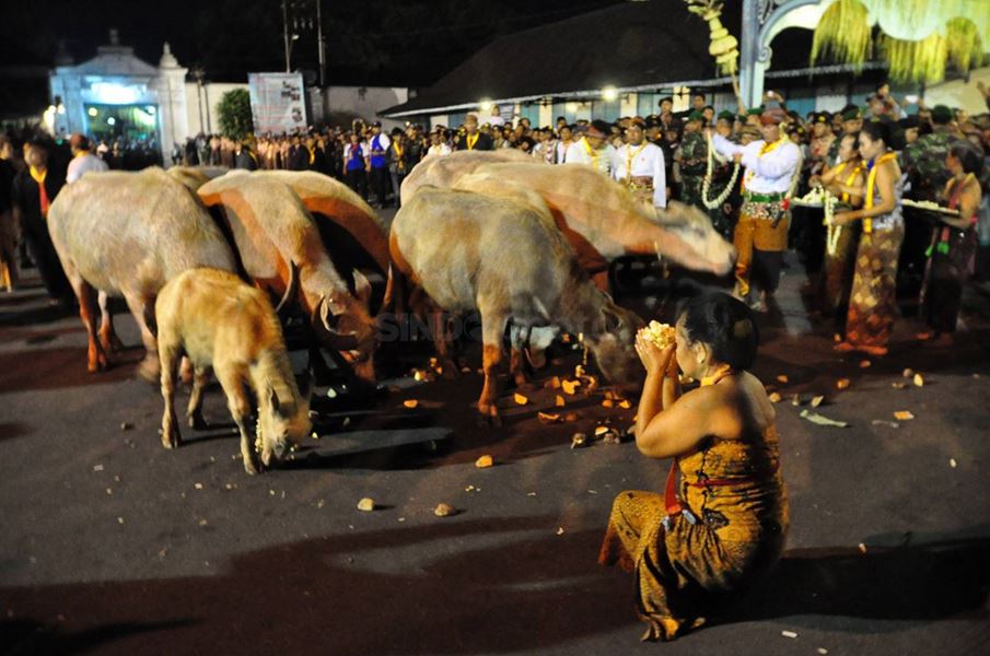 Five buffalos were seen in an iron cage. That was “Kebo Bule” (“Albino Buffalo”) which was usually paraded at “Malam Satu Suro” (“1st Muharram”) celebration parade around Solo City. It was a routine event which held by Surakarta Hadiningrat Palace to welcoming the arrival of Islamic New Year 1 Muharram.