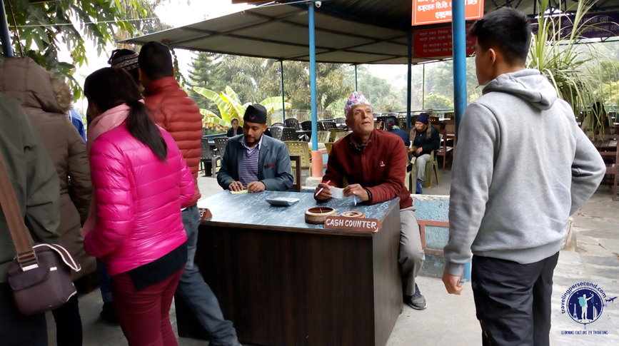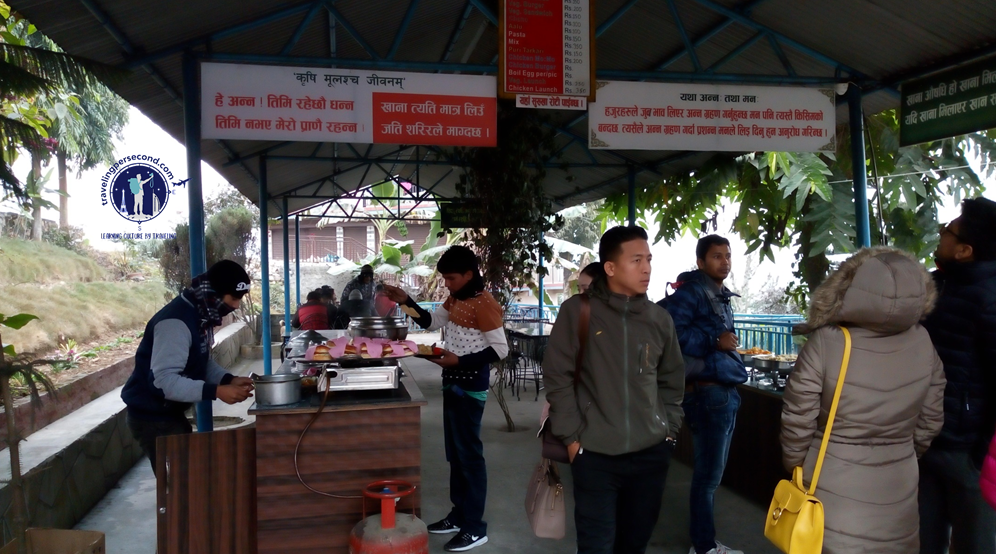 I felt hungry at lunch break on 1:30 p.m., enjoying a thali (Indian wide plate) of food which I picked up from buffet table for 400 Rupee and drink a free-orange juice which was given to all passengers since our departure in Pokhara.