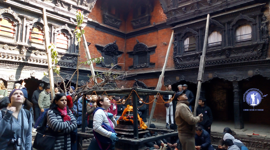 I kept eavesdropping on tour guide’s explanation to European travelers. It was said that the last king Malla often met in secret with Goddess Taleju who was asked to protect the kingdom. His wife who was suspicious, on a night followed the King when he was about to meet the Goddess. Suddenly the Goddess was angry because her whereabouts was revealed. But the Goddess was still kind enough to remain willing to protect the kingdom, but with one requirement, i.e by providing a girl as a reincarnation of her. Well, this girl was what I was going to see this time.