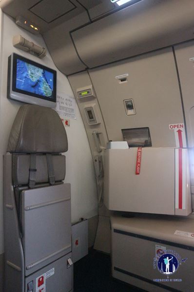 Begitu memasuki kabin, aku segera menelusuri cabin aisle untuk mencari keberadaan bangku bernomor 50G. Ternyata aku menemukannya di deretan bangku kolom tengah yang sejejar dengan emergency exit. Hal ini tentu menjadi sebuah keuntungan tersendiri karena aku akan mendapatkan ruang duduk yang cukup lega untuk menyelonjorkan kaki. Hanya satu kekurangannya, yaitu aku tidak akan mendapatkan fasilitas LCD screen untuk menonton film sepanjang penerbangan….Impas berarti….Hihihi.