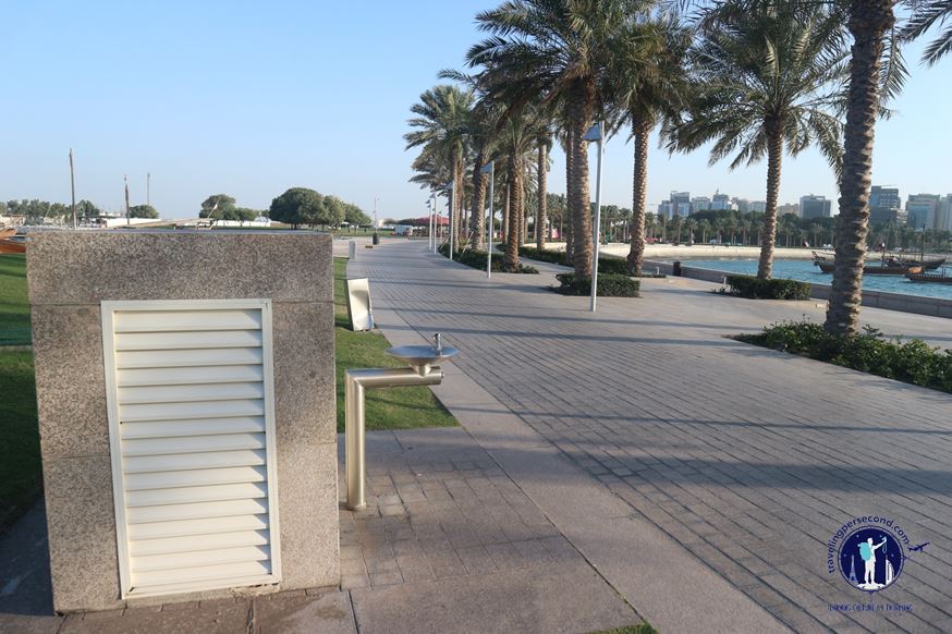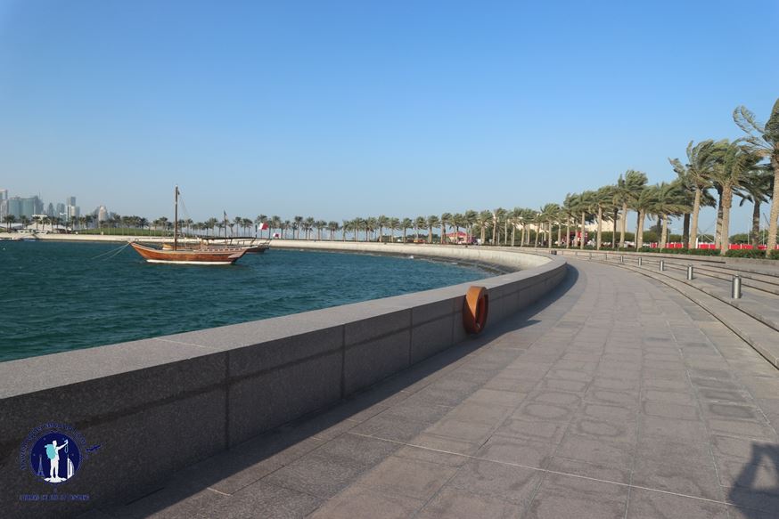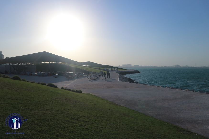 Back in the original direction heading my starting point, I passed a different promenade from the direction which I came from. Now I passed the southernmost promenade which was directly adjacent to Al Corniche Street. View of street on the left side was buildings with modern architecture. I could also see the Qatar Museum Gallery and a very large MIA Parking area.