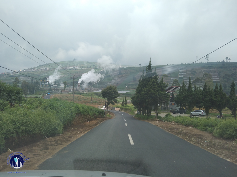 Tak lama kemudian aku memasuki kawasan Dataran Tinggi Dieng. Tentu aku takjub dengan pemandangan pegununungan yang dihiasi kabut. Tampak kepulan asap dari gas panas bumi muncul di beberapa titik. Pipa-pipa gas yang mengalirkan gas dari panas bumi tampak dominan di beberapa titik. Sedangkan lahan pertanian kentang dan sayuran juga menjadikan pemandangan menjadi lebih hijau nan indah.