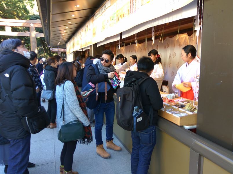 While at the end of the shrine, tourists could be seen queuing up at a shop which sells ema and omamori boards. The shop seemed to be guarded by beautiful women dressed in white and red kimonos, they looked polite and graceful to serve the visitors.