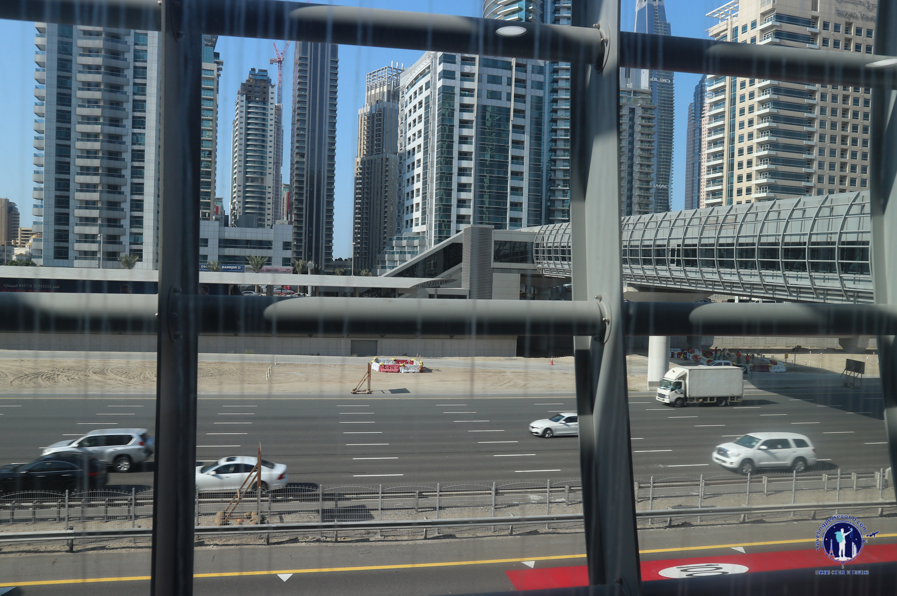 Perjalanan pendek bertarif 5 Dirham itu berhasil menurunkanku di DAMAC Properties Station, aku diarahkan menuju koridor skywalk yang gagah mengangkangi Sheikh Zayed Toll Road. Jalan tol itu sendiri memiliki enam jalur di setiap ruasnya.