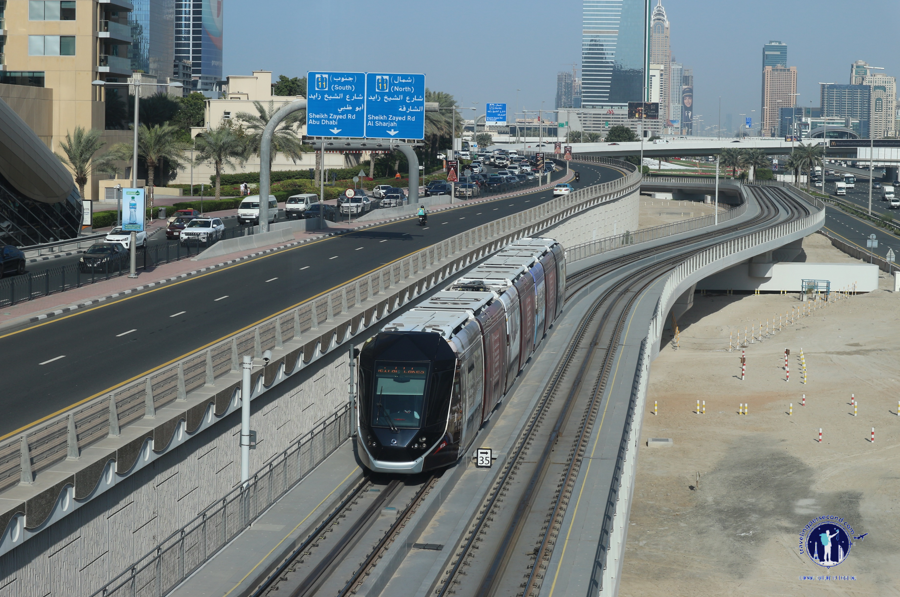 Di tengah skywalk, aku mencoba mengamati sekitar dan mencoba memahami rute transportasi massal di tempatku berdiri. Tampak di depan arahku melangkah adalah ujung skywalk dengan gerbang DAMAC Properties Station yang berlokasi di utara jalan tol. Sedangkan jalur tram tampak terlihat tepat di sisi utara Sheikh Zayed Toll Road. Itu artinya jalur Dubai Tram berada di pertengahan DAMAC Properties Station Gate sisi utara dan selatan.