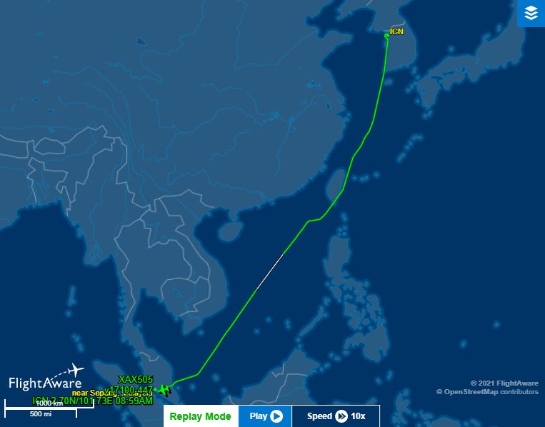 D7 505 itself was a flight of 5,000 kilometers with a travel time of 5 hours 50 minutes. The flight started from Incheon International Airport, South Korea and would end at Kuala Lumpur International Airport 2, Malaysia.