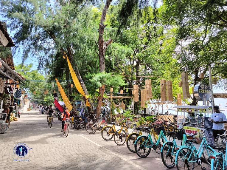 Aku mulai larut di jalanan di sepanjang garis pantai Gili Trawangan. Jalanan selebar 7 meter itu ramai dengan lalu lalang sepeda.