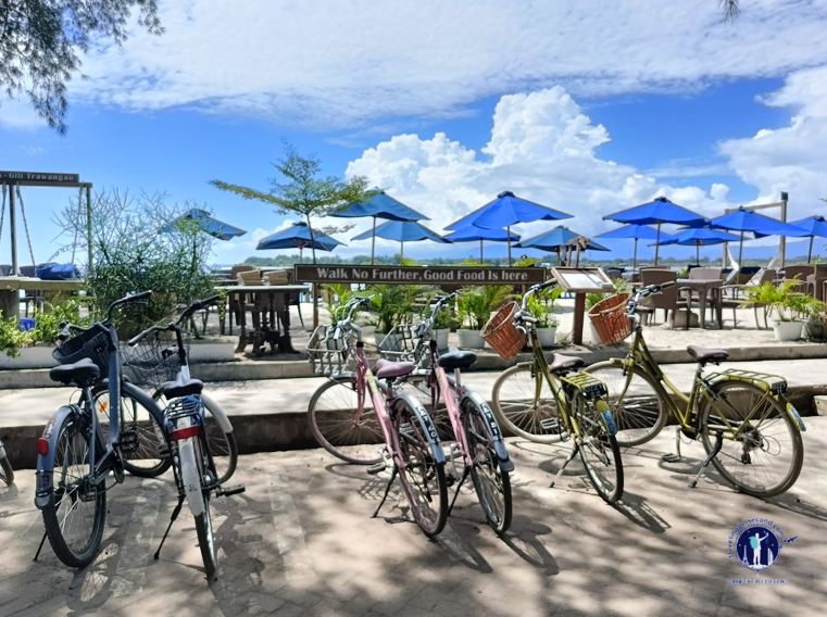 Mataku awas mencari tempat penyewaan sepeda karena aku ingin segera berkeliling Gili Trawangan. Aku sepenuhnya paham bahwa aturan adat di Gili Trawangan membuat setiap wisatawan tidak boleh menggunakan sepeda motor untuk berwisata.
