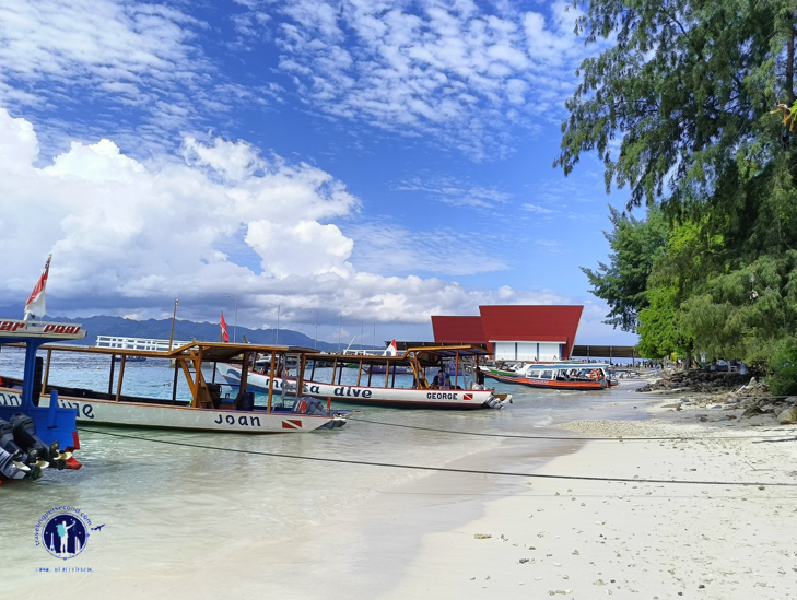 Menjelang pukul sebelas pagi, public boat yang kutumpangi perlahan merapat di Pelabuhan Gili Trawangan, perahu yang kutumpangi tepat datang bersisian dengan fast boat berkelir kuning emas yang membawa para wisatawan asing dari Pelabuhan Padang Bai di Pulau Bali. Pelabuhan Padang Bai sendiri berjarak hampir 70 km dari Pelabuhan Gili Trawangan. Perlu waktu 1,5 jam untuk melakukan perjalanan laut di antara kedua pelabuhan itu.